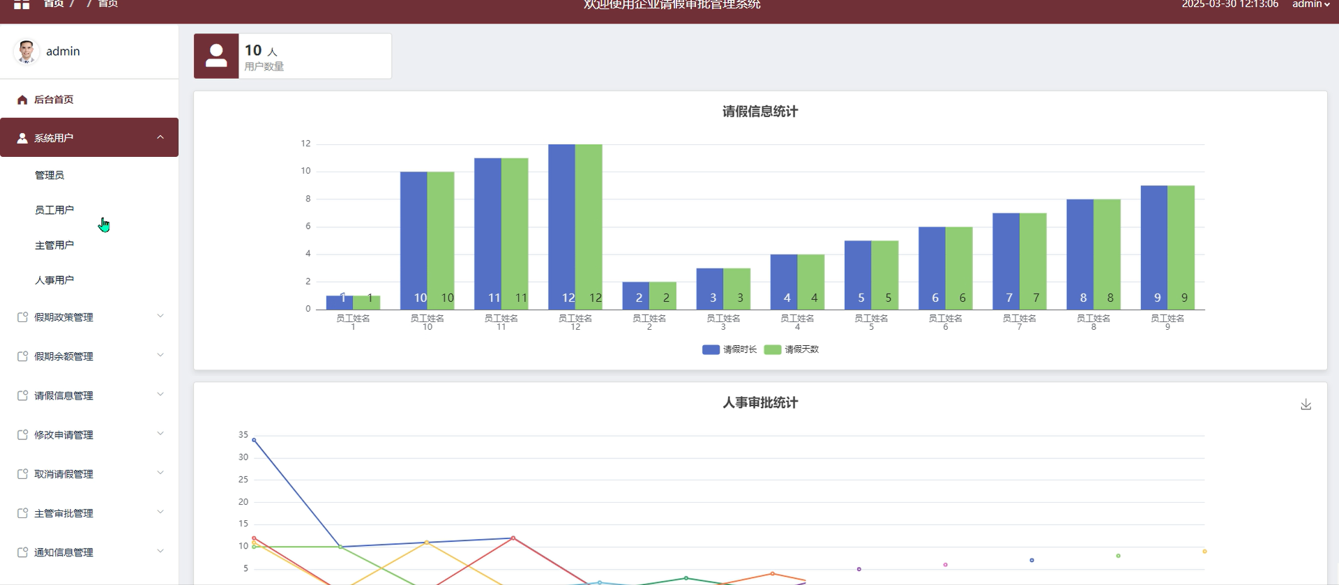 - 人事:员工请假数据多维度统计(部门 / 时间段 / 请假类型)、生成可视化报表(柱状图 / 饼图)、员工人事信息管理(修改 / 同步)、审批流程监控、请假政策通知发布。