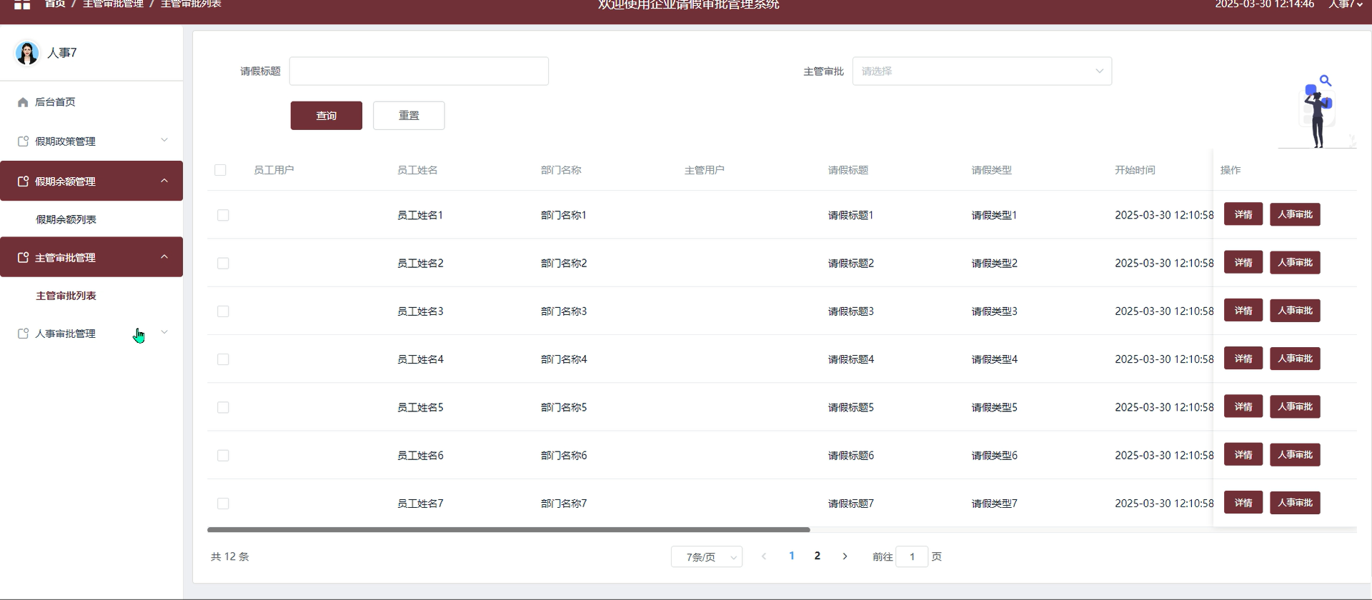 - 审批流程:审批人查看详情→执行审批操作→系统更新状态→通知员工→假期余额同步更新。