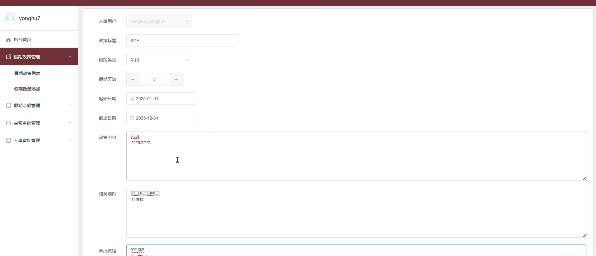 - 辅助功能:假期政策发布与查看、审批超时提醒、操作日志记录、敏感数据加密存储。