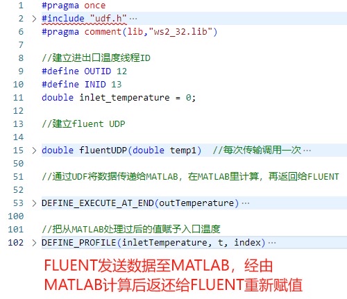 FLUENT与MATLAB联合仿真计算,基于UDP,可在MATLAB实现复杂数据计算处理。 提供两个软件数据交互方法和接口,FLUENT数据传递给MATLAB后,可以用任意方法处理,最后再回传给FLUENT处理后的数据。 本案例只是简单演示效果,可以实现复杂功能。