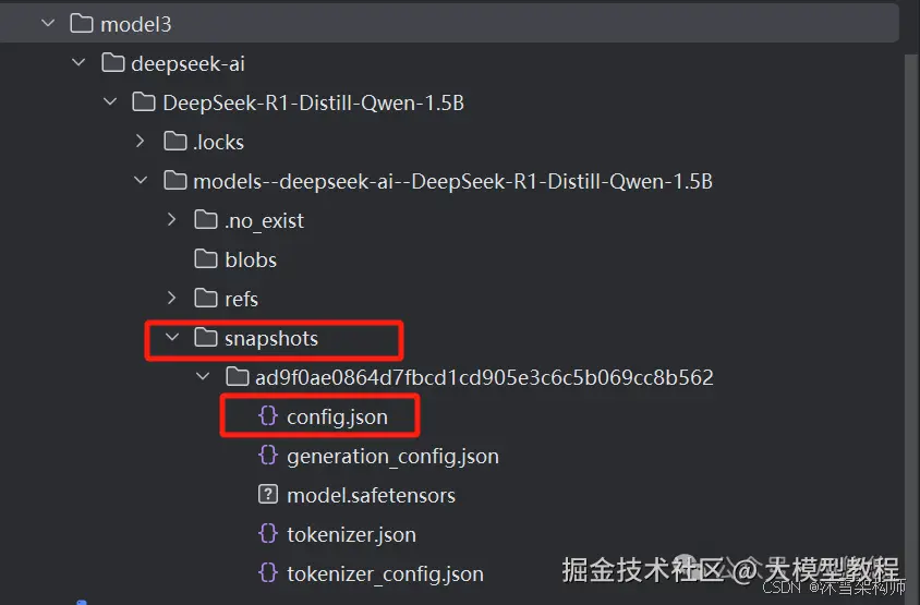 模型的核心内容主要是看 snapshots-config.json所在的目录,也是模型的默认目录地址。model.safetensors就是模型的源文件,