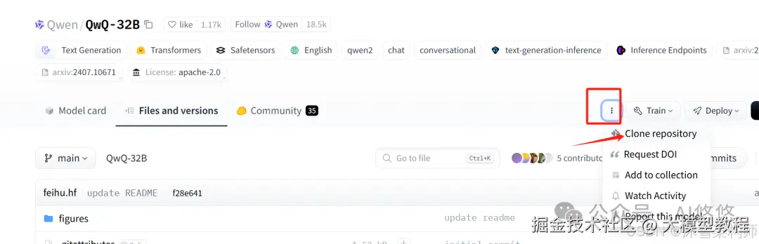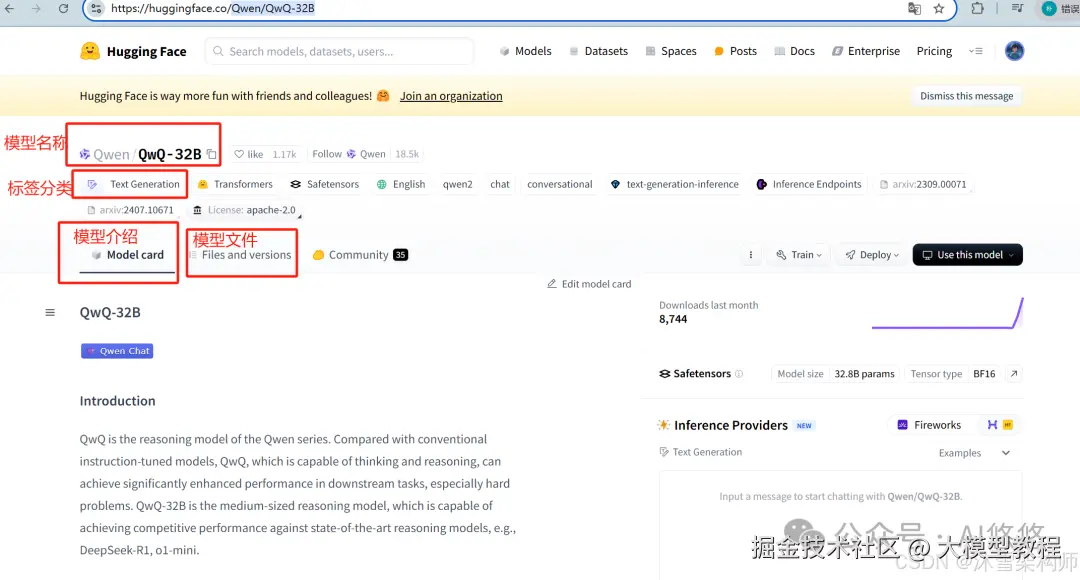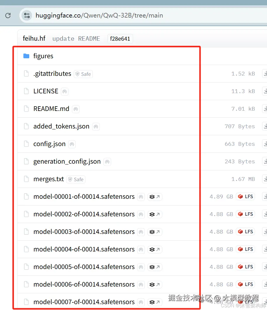 打开千问最新版本 Qwen/QwQ-32B,在"Files and Versions"模型文件页面下,可以看到很多类似"model-00001-of-00014.safetensors" ,后缀 safetensors就是模型文件的名称。