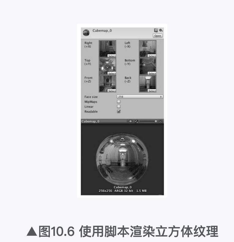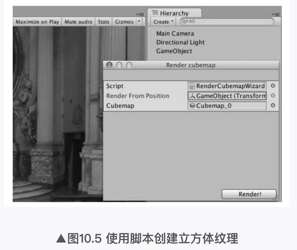 (3)从Unity菜单栏选择GameObject -> Render into Cubemap,打开我们在脚本中实现的用于渲染立方体纹理的窗口,并把第1步中创建的GameObject和第2步中创建的Cubemap_0分别拖曳到窗口中的Render From Position和Cubemap选项,如图10.5所示。