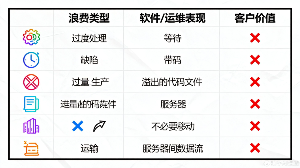 | 浪费类型 | 软件/运维中的表现 | 是否创造客户价值? |