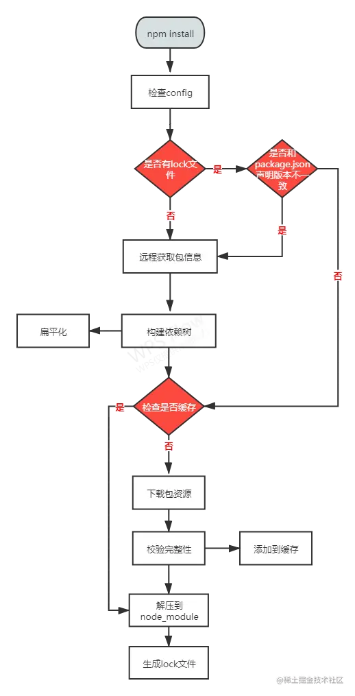 其实上述是一个没有缓存的install过程。其实,我们npm install可以用下列图一探究竟的: