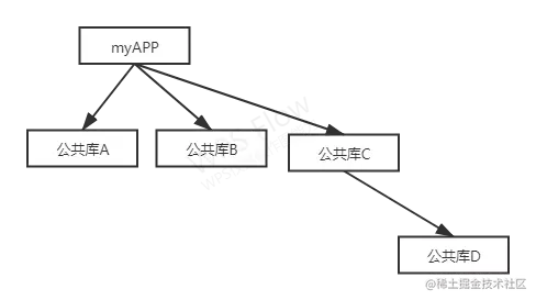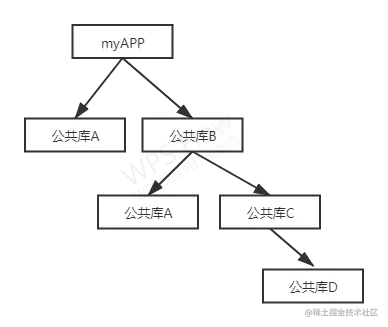 npm3.x之前是嵌套结构,那时候如果我们的项目中依赖了公共库 A 和公共库 B,同时公共库 A 也依赖了公共库 B,那公共库 B 会被多次安装 结构如图