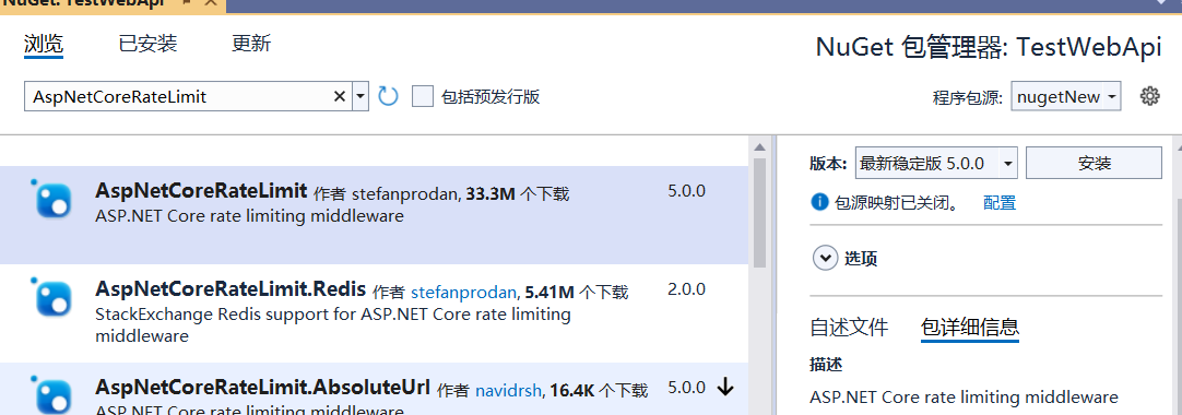 VS2022新建WebApi项目,在Nuget包管理器中搜索并安装AspNetCoreRateLimit包。