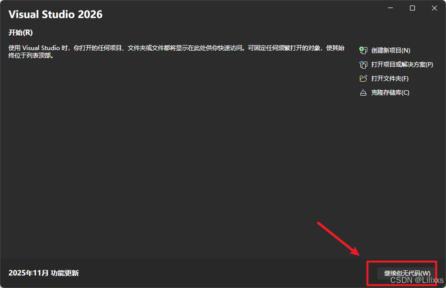 | 2. 安装完成后,打开 VS 软件 若提示新建项目,则点击【继续但无代码】跳过 | ![]() |