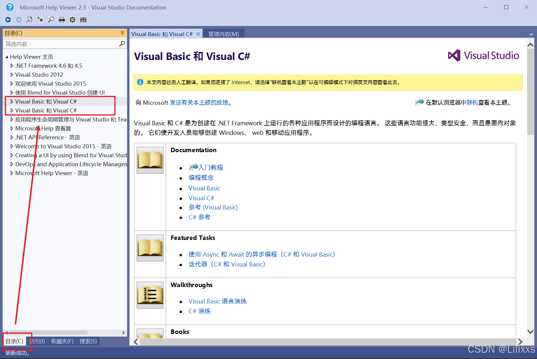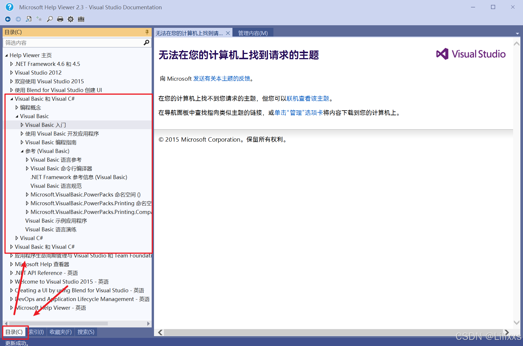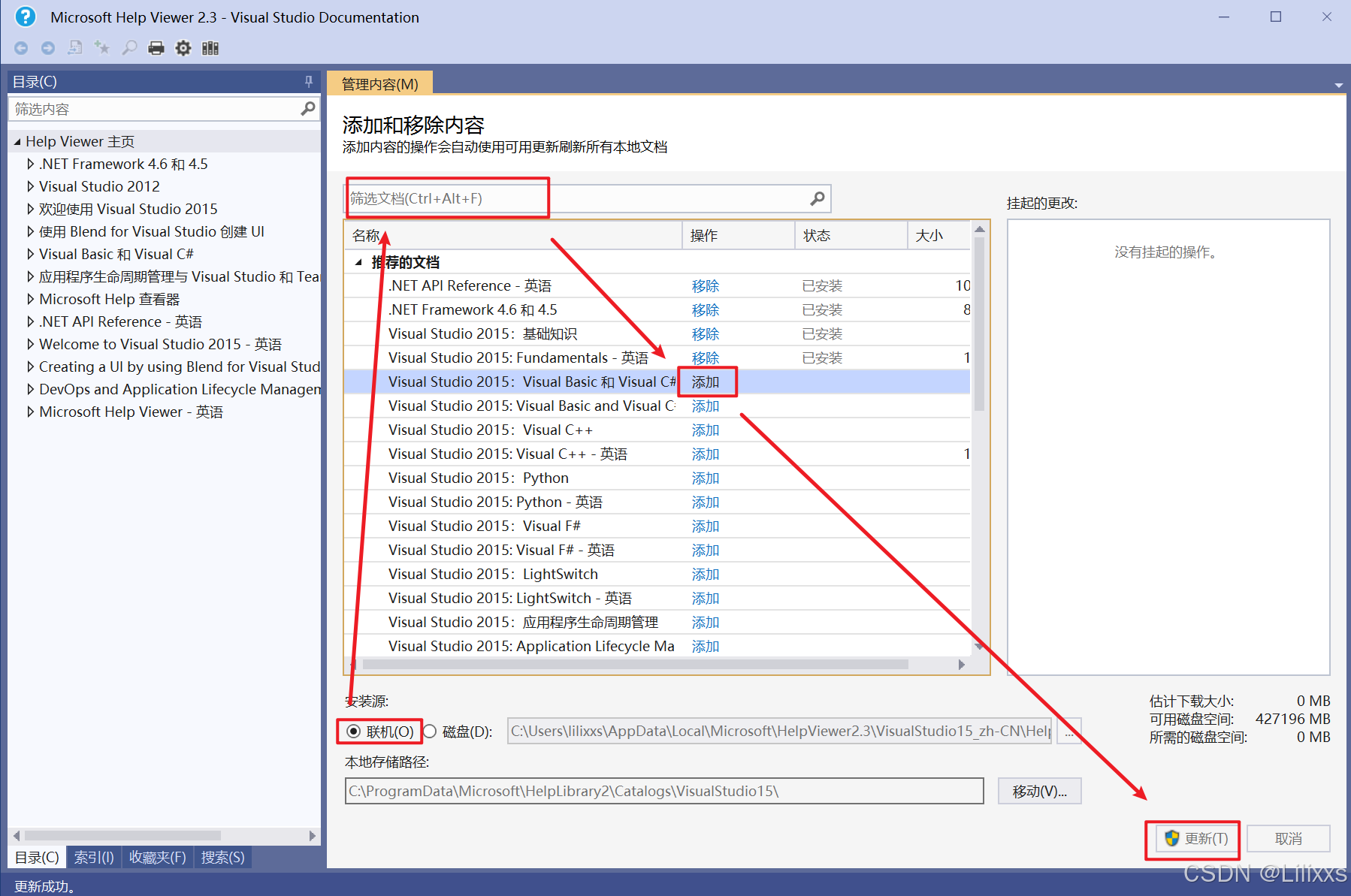 | 在 Help Viewer 中点击以下操作 1. 保持联网状态 2. 选择安装源:联机 3. 搜索框清空 4. 在"Visual Basic"一行,点击"添加" 5. 点击右下角【更新】 6. 此时软件会自动从网上下载帮助文件,耐心等待下载安装完成即可 | ![]() |