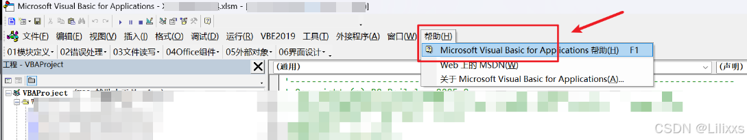 现在在 Excel 或 WPS 表格中的 VBA 代码编辑器,点击快捷键F1或点击【帮助】菜单中的选项,会跳转到在线网页帮助