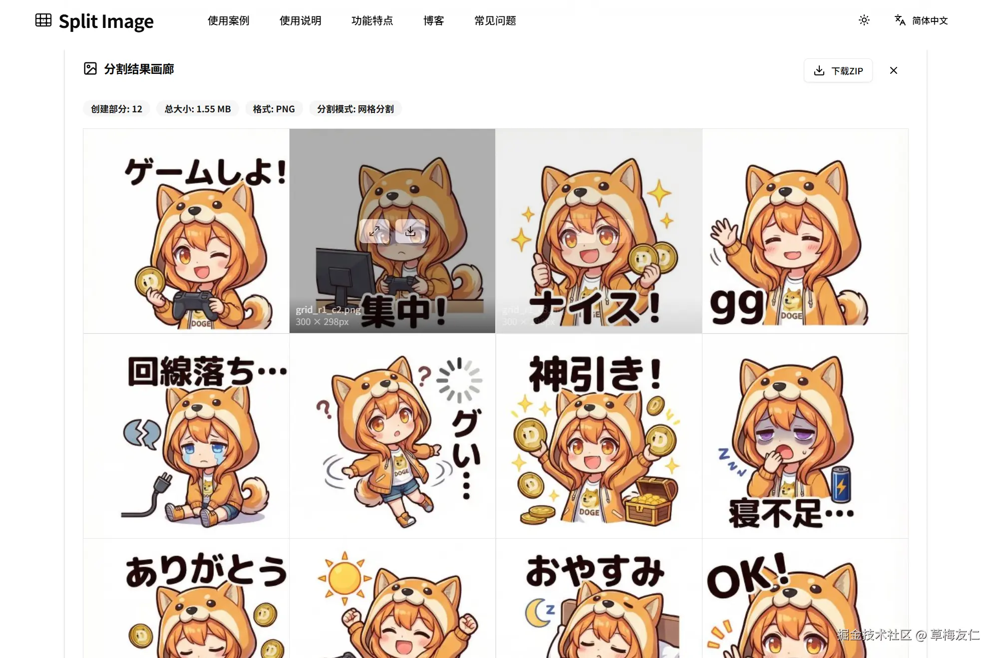 比如说 免费在线图片分割工具,就能直接分割出 12 张表情包,效果非常不错。