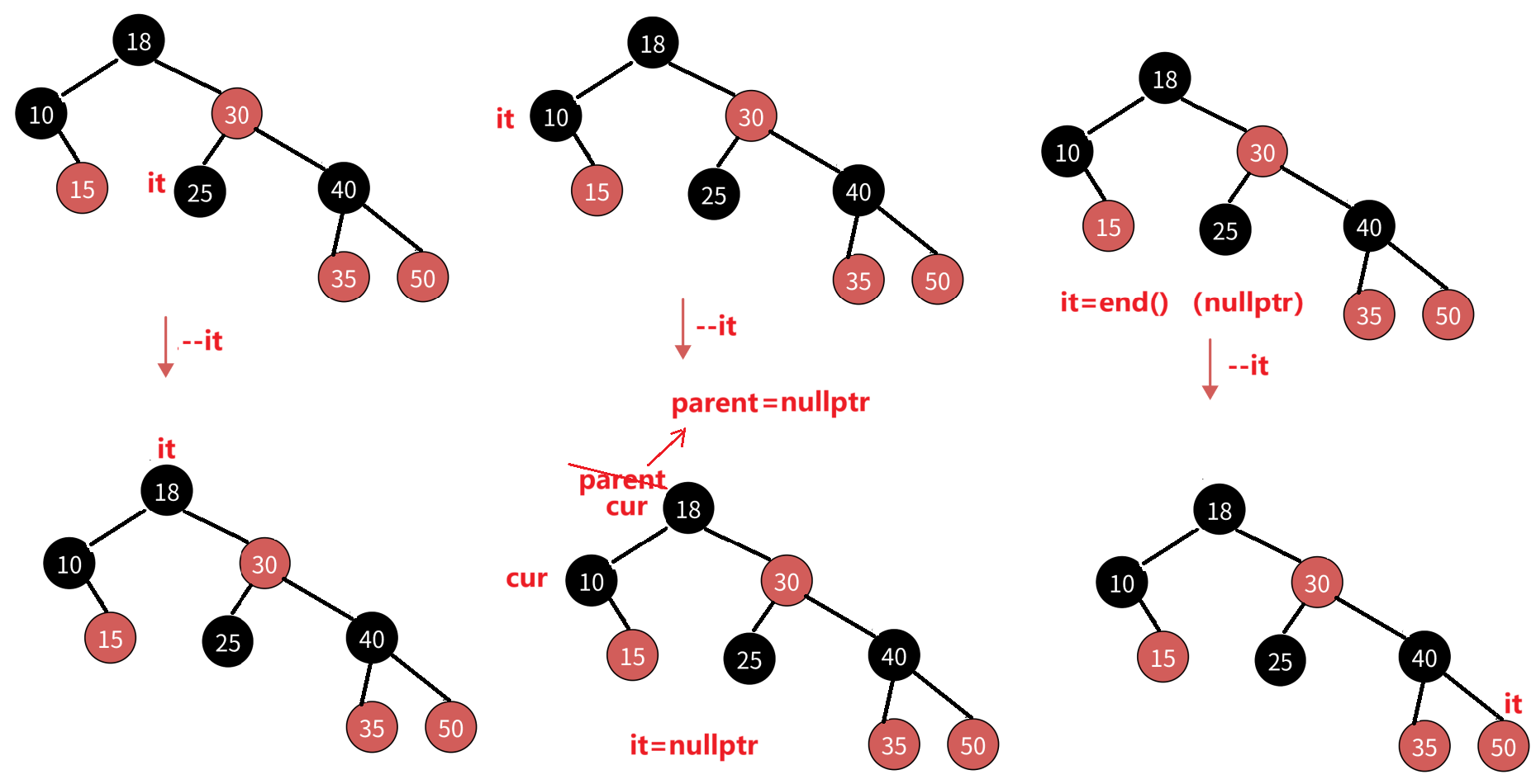 - 情况1:迭代器指向end(),operator--需要移动到中序的最后一个节点,即右子树的最右节点(因为需要走到最后一个节点,需要从根开始,那么迭代器就需要增加一个成员变量_root)。