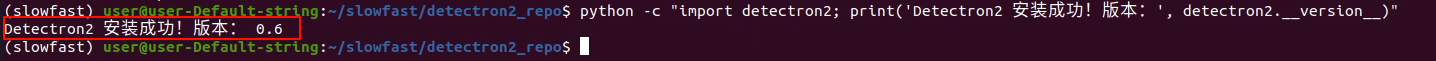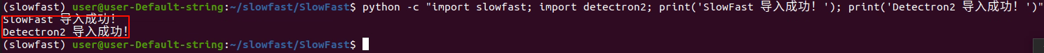 python -c "import slowfast; import detectron2; print('SlowFast 导入成功!'); print('Detectron2 导入成功!')"