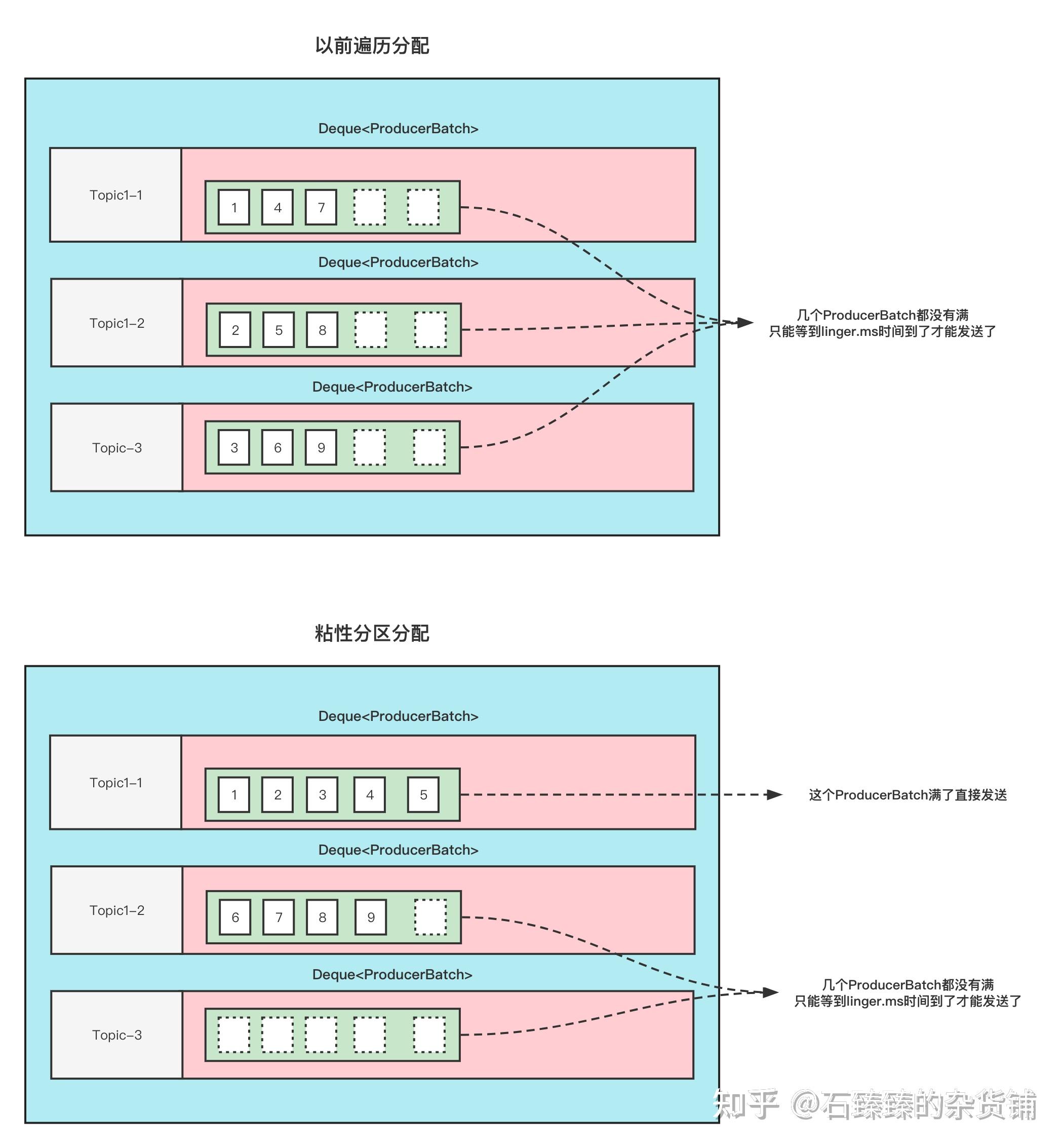 假设每个消息的大小是固定的,每个元素能放置 5 个消息,如果有 3 个分区,9 条消息,按照轮询算法,每个分区的发送队列的最后一个元素都会放 3 个消息,没有一个填满的,都需要等到等待时间结束才能发送。而按照粘性分区算法,第1个分区的末尾元素能填满 5 条,第二个分区的末尾元素存放 4 条,这样分区 1 的这个元素就可以进行发送了。