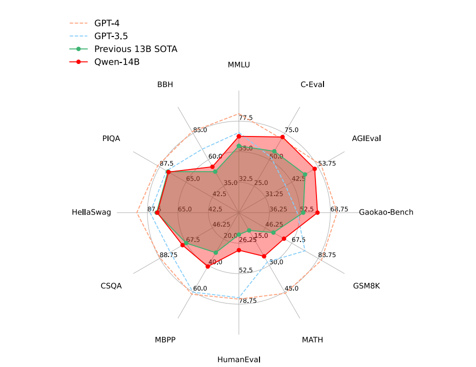 图 2:GPT-4、GPT-3.5、之前的 13B SOTA 模型以及 QWEN-14B 的性能。我们在涵盖语言理解、知识、推理等多个领域的 12 个数据集上展示了结果。QWEN 的性能显著优于之前类似规模的 SOTA 模型,但仍落后于 GPT-3.5 和 GPT-4.
