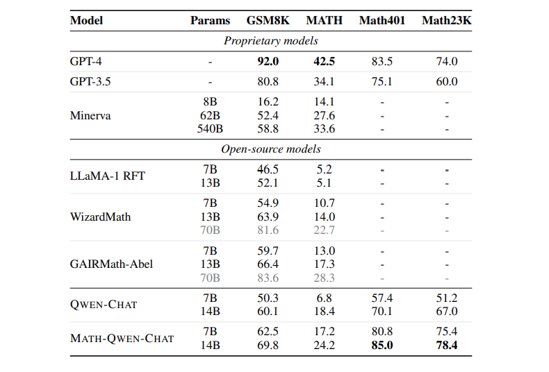 本研究还介绍了MATH-QWEN-CHAT,专门设计用于解决数学问题。我们的结果表明,MATH-QWEN-7B-CHAT和MATH-QWEN-14B-CHAT在同等规模的开源模型中具有显著优势,并且在与数学相关的基准数据集(如GSM8K(Cobbe等,2021)和MATH(Hendrycks等,2021))上的表现接近GPT-3.5。