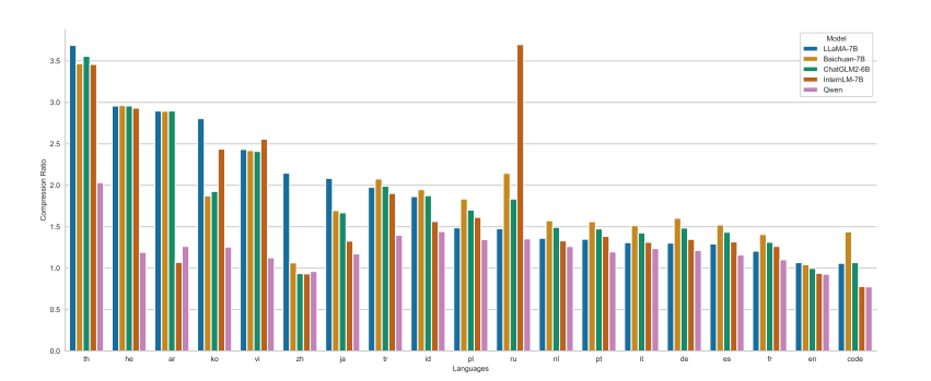 图 3:不同模型的编码压缩率。我们随机选取每种语言的 100 万份文档语料库来测试和比较不同模型的编码压缩率(以支持 100 种语言的 XLM-R(Conneau et al.. 2019)为基准值1,图中未显示)。可以看出,QWEN在确保高效解码中文、英文和中文代码的同时,也对许多其他语言(例如泰语、希伯来语、阿拉伯语、韩语、越南语、日语、土耳其语、印尼语、波兰语、俄语、荷兰语、葡萄牙语、意大利语、德语、西班牙语、法语等)实现了高压缩率,赋予模型在这些语言中强大的可扩展性和高训练及推理效率。