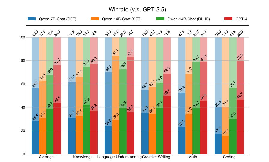 图 4:聊天模型的人工评估结果。我们将 Qwen-7B(SFT)、Qwen14B (SFT)、Qwen-14B (RLHF)以及GPT-4 与 GPT-3.5 进行比较。每个柱状图段代表胜、平、负的百分比,从下到上依次排列。平均而言,RLHF 模型优于 SFT 模型。数据集包含 300 条中文指令。