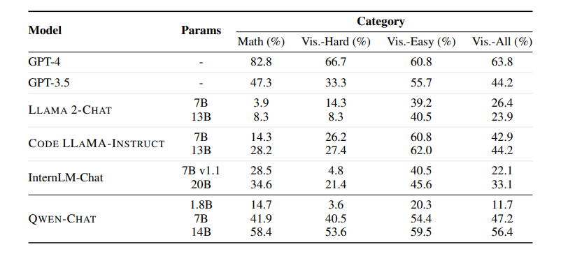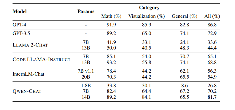 在评估指标方面,我们同时考虑代码的可执行性与正确性。关于正确性指标,对于数学问题,我们通过验证最终响应和代码执行结果中是否都包含真实数值答案来衡量准确率。在数据可视化方面,我们使用 QWEN-VL(Bai et al., 2023)来评估准确率。QWEN-VL 能够回答由文本和图像组成的问题,我们依赖它确认代码生成的图像是否满足用户请求。