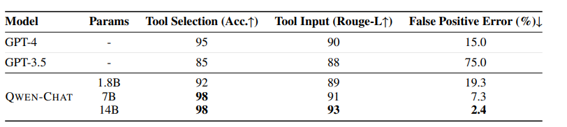使用 ReAct Prompting 进行工具调用。我们构建并公开了一个基准,用于评估 QWEN 在使用 ReAct Prompting 调用插件、工具、函数或 API 方面的能力(参见 Qwen Team, Alibaba Group, 2023b)。为确保公平评测,我们从评估集中排除所有出现在 QWEN 训练集中的插件。该基准评估模型从最多 5 个候选工具中选择正确工具的准确率、传递给工具的参数的合理性,以及错误调用(false positives)的频率。在该评估中,错误调用指的是当模型面对一个不需要任何工具的问题时,仍然错误地调用了工具。