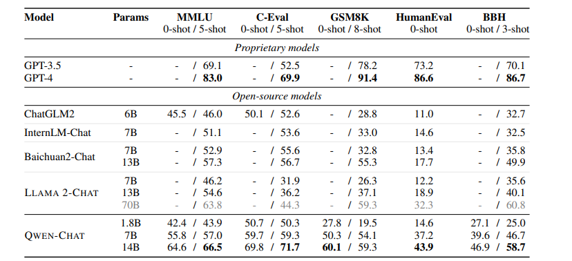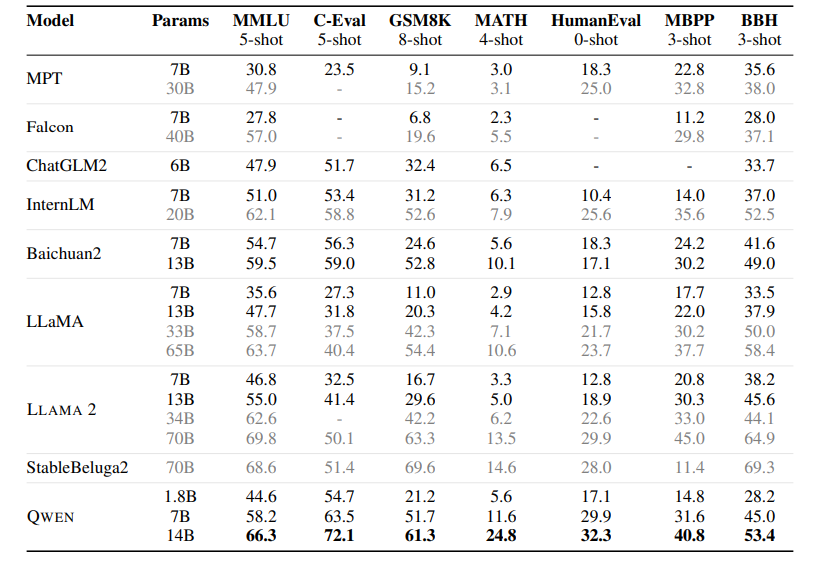 表2:与开源基础模型相比,在常用基准测试中的总体性能。我们最大的QWEN模型拥有140亿个参数在所有数据集上均优于之前130亿参数的最先进模型