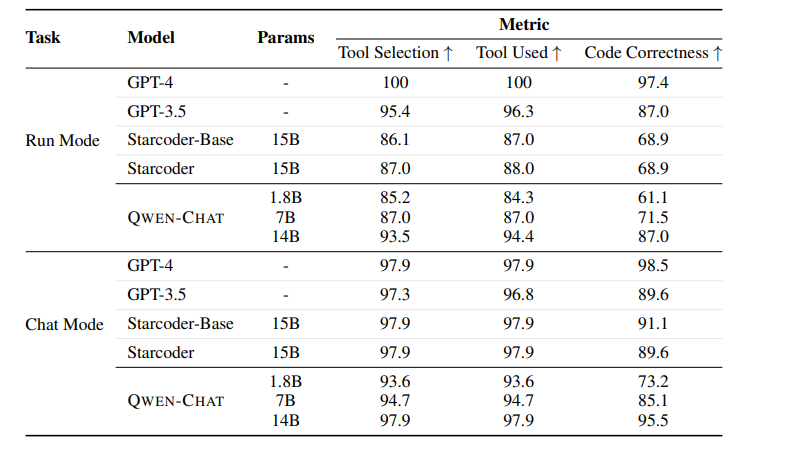 表9:QWEN-Chat 在 Hugging Face Agent 基准测试中的结果