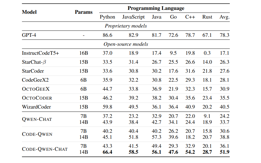 我们的分析表明,专用模型,特别是CODE-QWEN和CODE-QWEN-CHAT,在相似参数量的情况下,明显优于以往的基线模型,例如OCTOGEEX (Muennighoff et al., 2023)、InstructCodeT5+ (Wang et al., 2023d)和CodeGeeX2 (Zheng et al., 2023)。实际上,这些模型甚至可以与更大规模的模型如Starcoder (Li et al., 2023d)的性能相媲美。