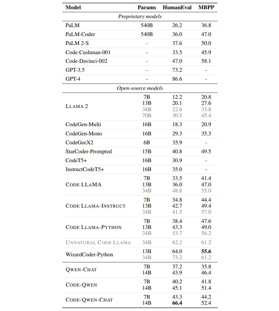 表10:HumanEval和MBPP 的 pass@1(%)结果。大部分分数来自 StarCoder(Li等人,2023d)CodeT5+(Wang等人,2023d)、WizardCoder(Luo 等人,2023b)和 CODE LLAMA (Roziere 等人,2023)的论文。