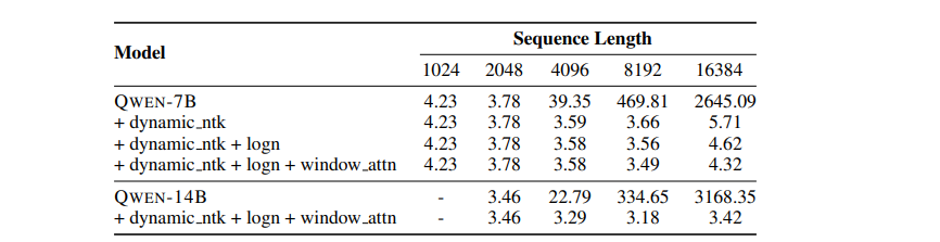 为了评估上下文长度扩展的效果,表 3 展示了模型在 arXiv 上的困惑度(PPL)测试结果。这些结果表明,通过结合 NTK-aware 插值、LogN-Scaling 以及分层窗口分配,我们能够在超过 8192 tokens 的上下文长度下有效保持模型性能。