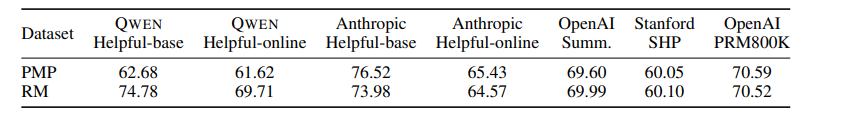 表 4:QWEN 偏好模型预训练 (PMP) 和奖励模型(RM)在各种人类偏好基准数据集上的测试准确率