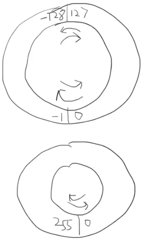 -128 ~ 127(8 位有符号数的范围); - 圈是 "循环的":比如