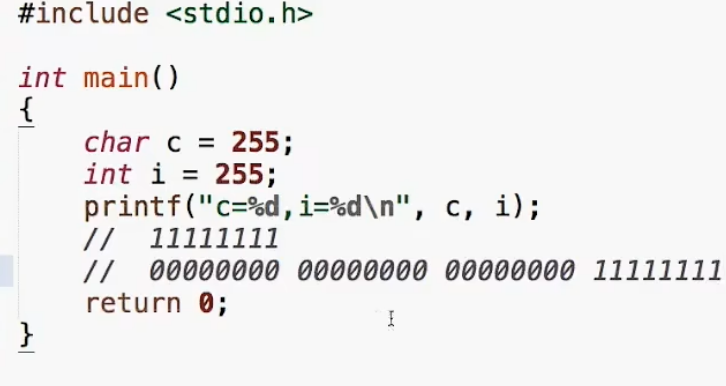 同样的数值 255,因为存在不同大小的 "盒子"(char和int)里,且 "解读规则" 不同: