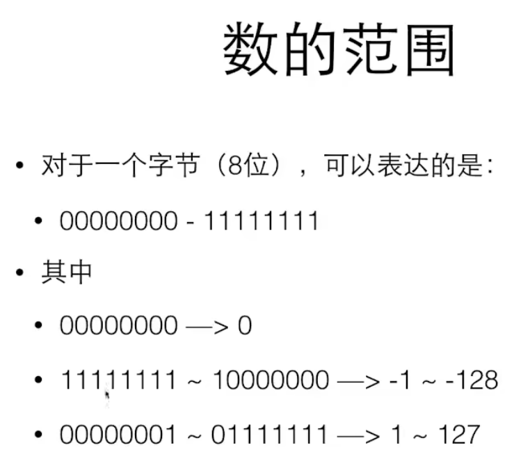 1 个字节(8 位补码)能表示的所有数值是:-128 ~ 0 ~ 127(共 256 个数,刚好对应00000000 ~ 11111111的 256 种二进制组合)