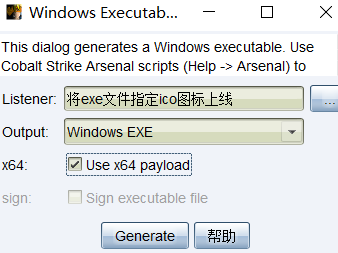 保持默认配置,选择监听器,勾选x64,点击generate,生成1.exe文件(这个可以用生成的python的payload编译成exe,可以免杀)