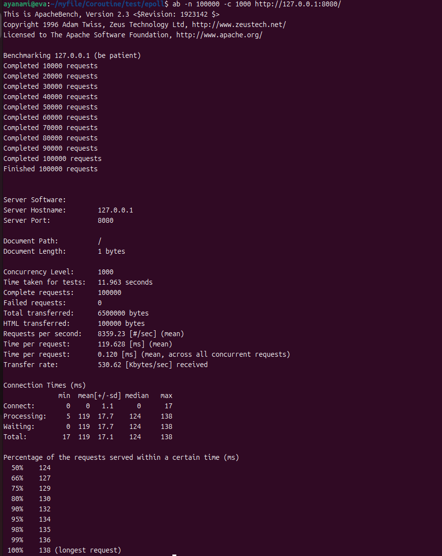 多次测试本项目和其他测试对比发现问题:在2核情况下,并且业务简单的情况下,本项目的性能比原生epoll差。原因: