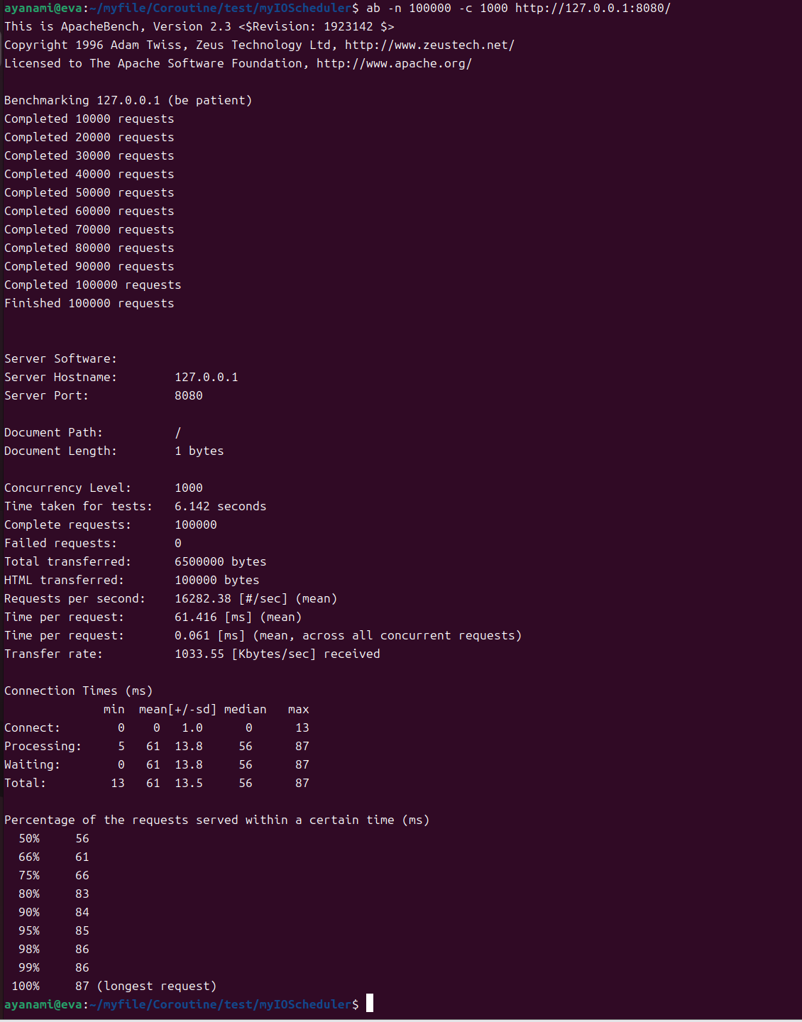 bashubuntu@EVA:~/myfile/Coroutine/2fiber$ ./test number 10 hello world 0 hello world 1 hello world 2 hello world 3 hello world 4 hello world 5 hello world 6 hello world 7 hello world 8 hello world 9 ------------------------------ try get fibonacci:0 fibonacci:0 try get fibonacci:1 fibonacci:1 try get fibonacci:2 fibonacci:2 try get fibonacci:3 fibonacci:3 try get fibonacci:4 fibonacci:4 try get fibonacci:5 fibonacci:5 try get fibonacci:6 fibonacci:6 try get fibonacci:7 fibonacci:7 try get fibonacci:8 fibonacci:8 try get fibonacci:9 fibonacci:9 try get fibonacci:10