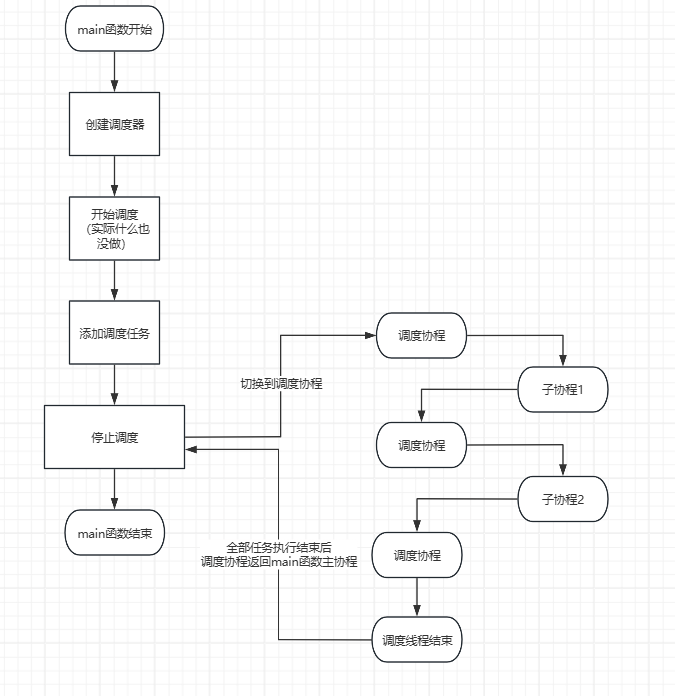 - 所有任务都执行完之后,调度协程还要让出执行权并切回main函数的主协程,以保证程序的顺利结束