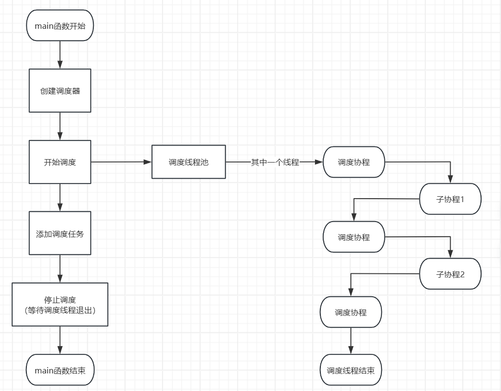 因为有单独的线程用于协程的调度(调度器线程或者main主线程),那只需要让调度线程的入口函数作为调度协程,从任务队列里取任务执行就行了;main函数(main主线程和调度器线程)不参与协程的调度,所以只需要将任务添加到调度器中即可,在适当的时机停止调度器,当调度器停止时,main函数要等待调度线程结束后再退出。