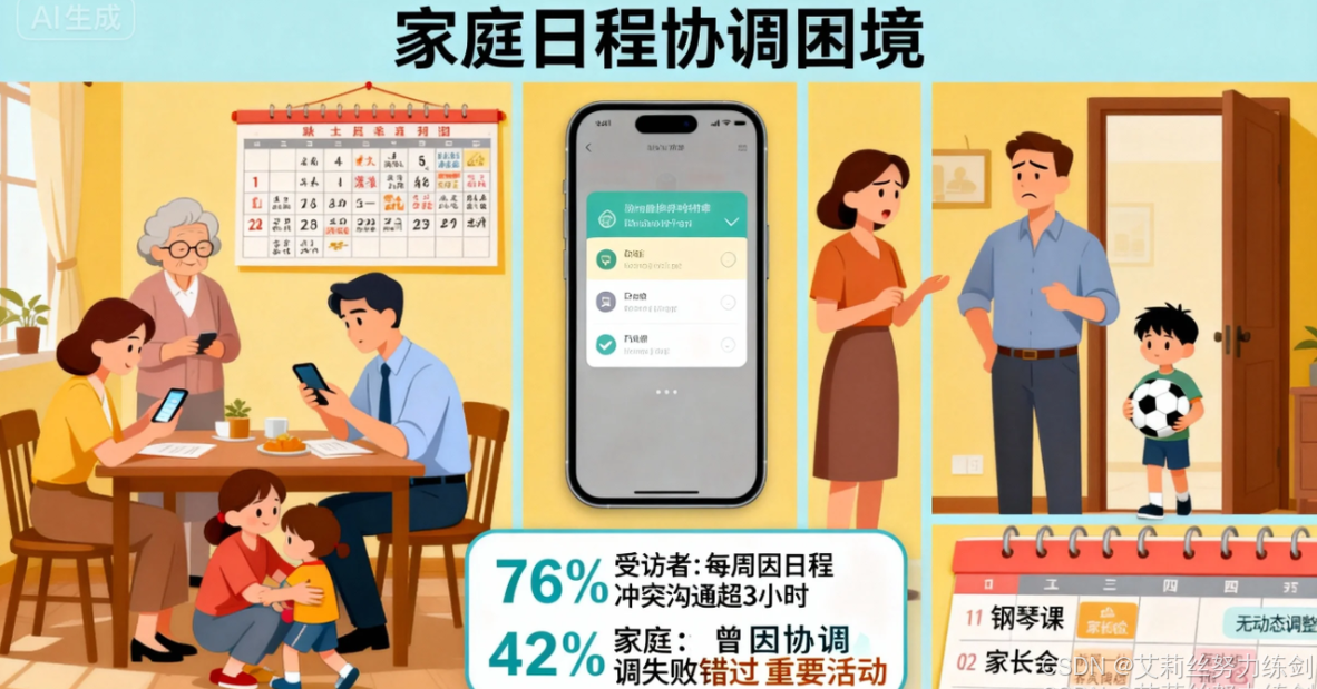 当代家庭结构日益复杂,双职工家庭、多代同堂、孩子课外活动频繁等现象使得家庭日程协调变得异常困难。传统日历应用虽然能记录事件,但缺乏主动协调能力,无法根据家庭成员的实时状态动态调整计划。一项针对1000个家庭的调查显示,76%的受访者表示家庭成员间因日程冲突导致的沟通成本每周超过3小时,42%的家庭曾因日程协调失败而错过重要家庭活动。