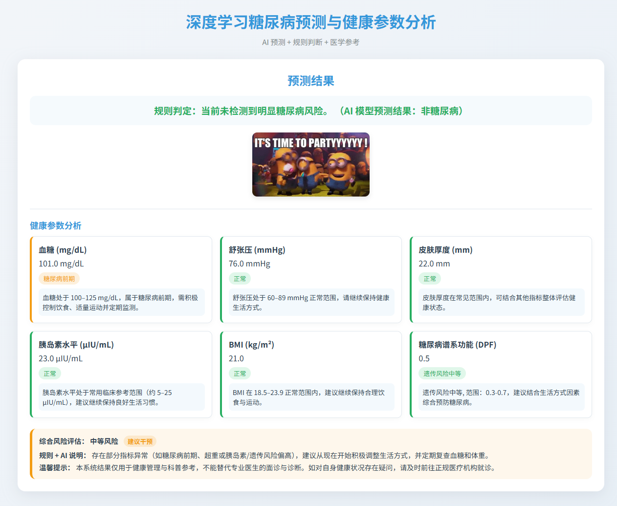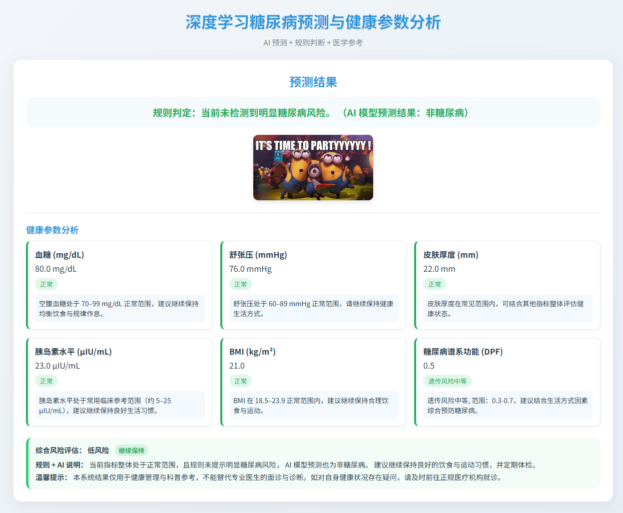 综上所述,本研究完成了一套从数据清洗、深度学习建模、规则融合推理到 Web 部署与数据库管理的完整糖尿病智能预测系统。系统结构轻量、部署简单、可扩展性强,可为基层医疗机构、健康管理平台及相关研究人员提供一种实用、可解释且具有推广潜力的疾病风险预测工具。