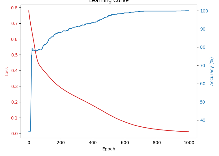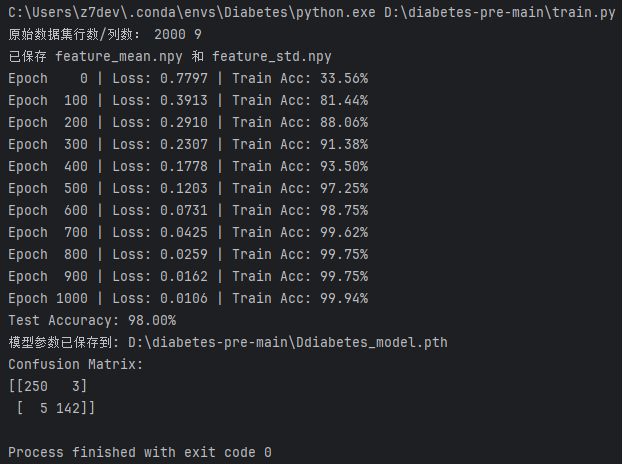模型部分构建了由三层全连接结构(8-64-32-1)组成的深度神经网络,以 ReLU 和 Sigmoid 作为激活函数,并采用二元交叉熵损失函数与 Adam 优化器进行训练。模型训练 1000 轮后,在测试集上取得良好分类性能,并通过混淆矩阵、ROC 曲线与学习曲线对模型的性能与收敛情况进行了分析。训练完成后,模型参数及标准化参数分别以 Ddiabetes_model.pth、feature_mean.npy 与 feature_std.npy 的形式持久化,用于后续部署。