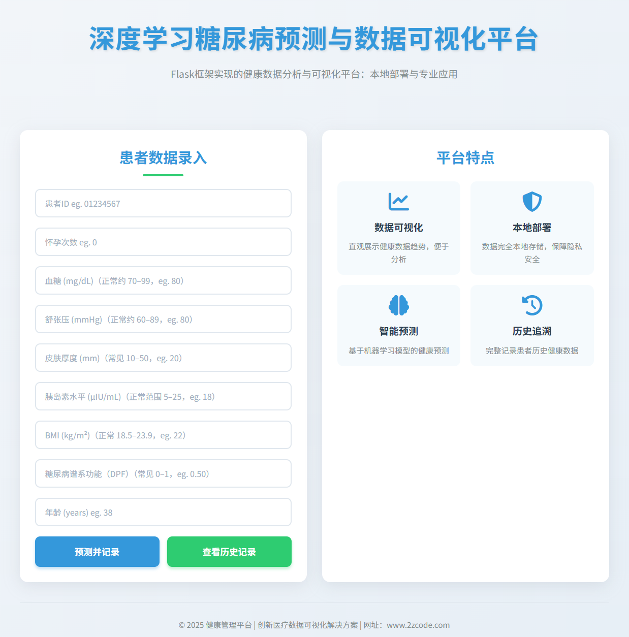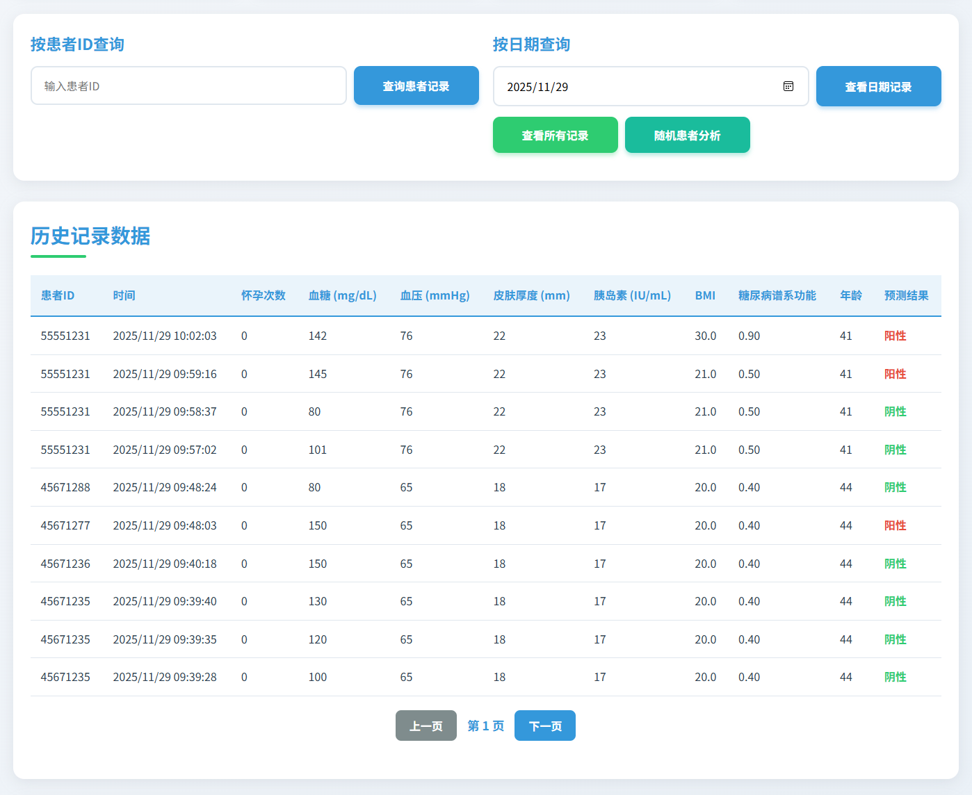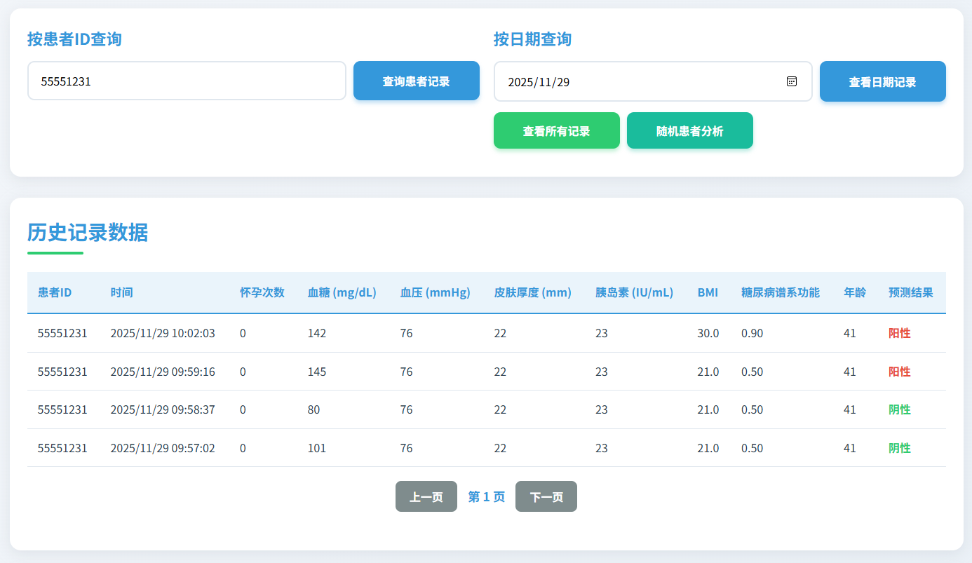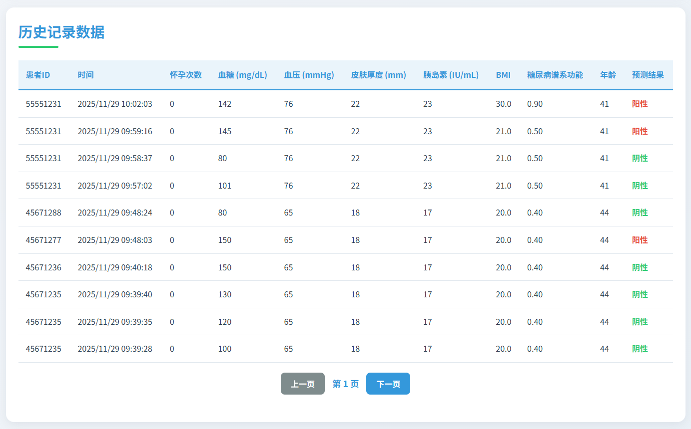 系统部署部分基于 Flask 框架实现 Web 化服务。后端加载训练好的 PyTorch 模型,对用户输入的八项生理指标进行标准化处理后生成预测结果,并结合医学规则(如空腹血糖阈值、BMI 与胰岛素水平组合条件)对模型输出进行风险校正,以增强系统的可解释性与临床适用性。系统采用 SQLite 数据库存储所有用户记录,开发了包括患者数量统计、历史记录查询、特征均值比较、糖尿病分布等多项 API 接口,实现了对历史健康数据的可视化管理与动态查询。