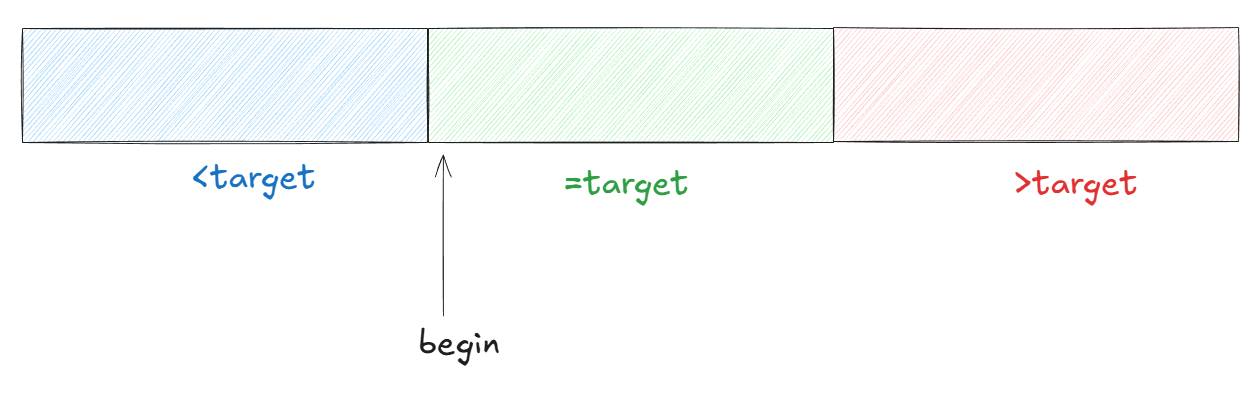 可以看到我们左端点可以将数组划分成两个区间,左边是<target,右边是>=target。其中我们的begin是右边区间的元素。