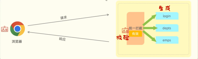 - 后续每个请求,都要携带JWT令牌,系统在每次请求处理之前,先校验令牌,通过后,再处理