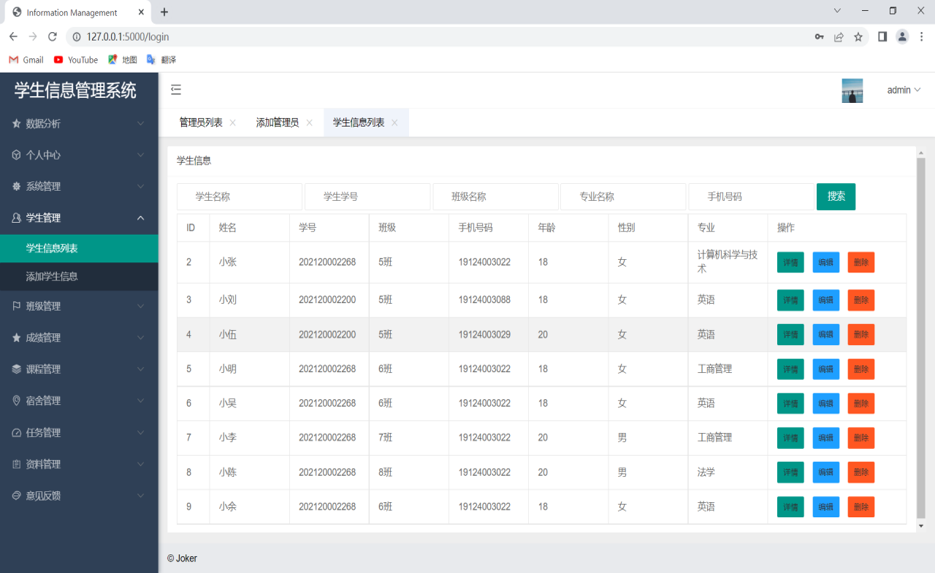 - 学生管理:支持增删查改,学号、专业、手机号这些字段都齐了,还能批量导入数据;