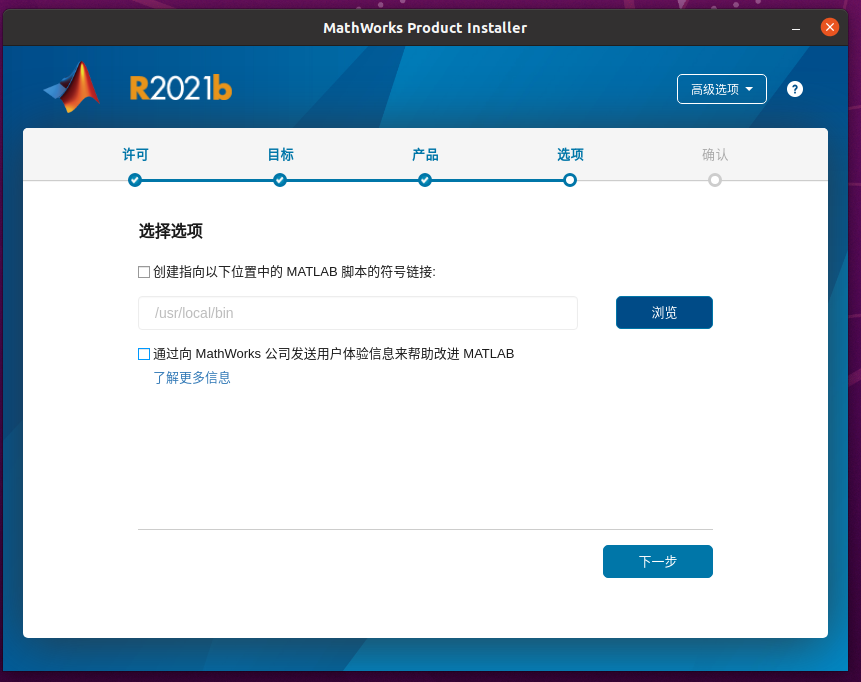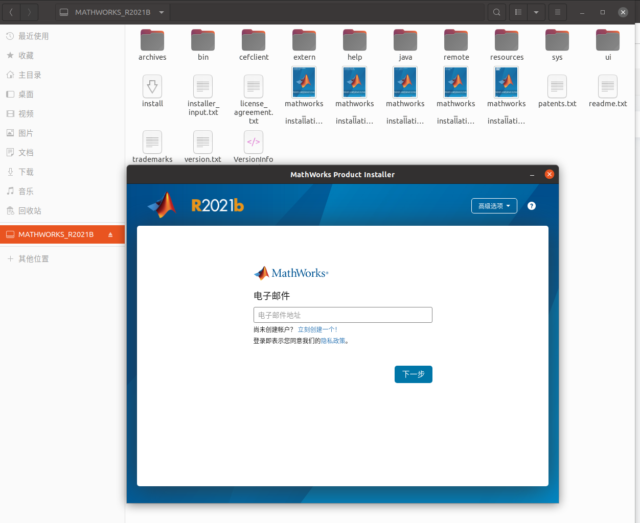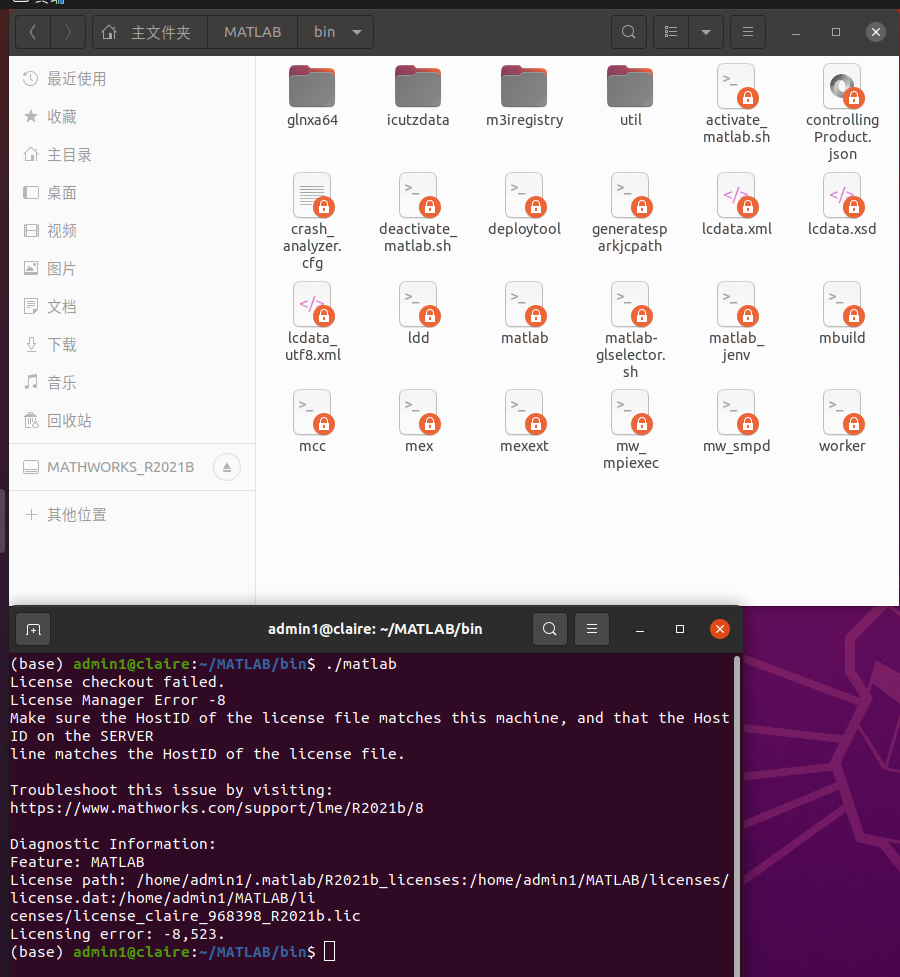 运行MATLAB:进入/matlab/bin文件夹,右键选择"在终端打开",输入 ./matlab。提示许可证失效。需要破解。