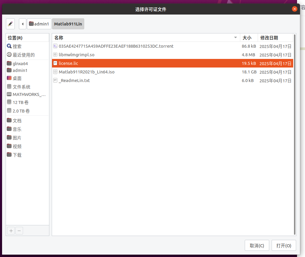 打开一开始有iso文件的文件夹,找到"libmwlmgrimpl.so"文件。打开MATLAB安装目录下的/bin/glnxa64/matlab_startup_plugins/lmgrimpl/",找到libmwlmgrimpl.so,替换成前面的.so文件。