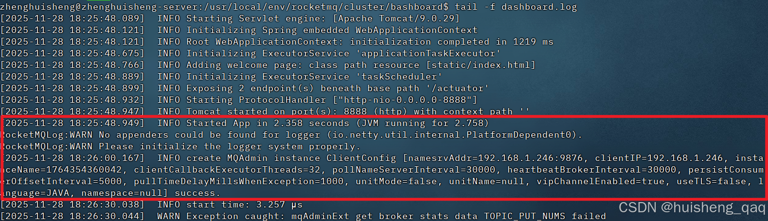 上面启动是将日志放在 /usr/local/env/rocketmq/cluster/dashboard 路径下的 dashboard.log 文件中,所以可以直接看启动日志