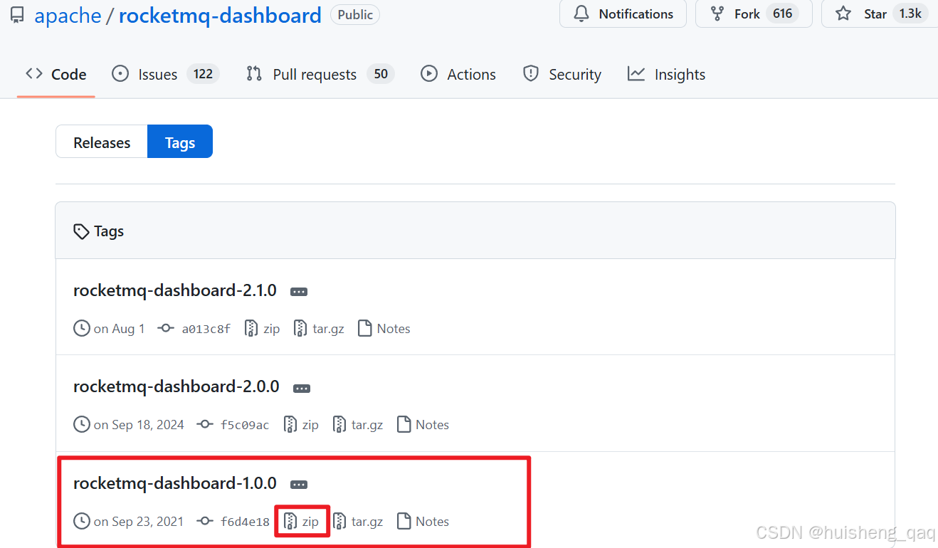 首先打开官方推荐的可视化界面的网址:https://github.com/apache/rocketmq-dashboard/tags ,其内容如下,因为目前用的是4.x的版本,所以选择1.0版本即可,并且下载zip的压缩包即可,需要在本地改一些配置,再打包丢到服务器上面运行(当然也可以选择直接再本地运行,如果rocketmq用5.x版本,则必须用--Dashboard2.x的可视化包)
