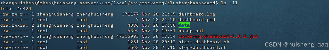 zhenghuisheng@zhenghuisheng-server:/usr/local/env/rocketmq/cluster/bashboard$ ls -ll